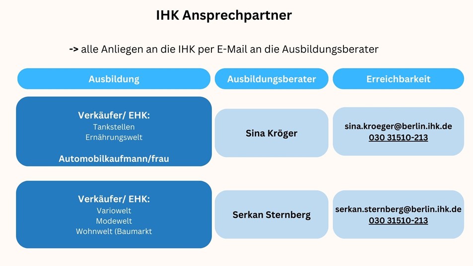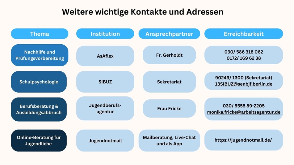 Wir bieten unseren Auszubildenden und Schüler*innen unterstützende Gesprächsangebote rund um die Ausbildung oder vollzeitschulischen Bildungsgänge an. Wir kennen berlinweit Kontakte zu weiterführenden Beratungs- und Hilfsangeboten (Beratungsstellen, Fachdienste und Psycholog*innen).